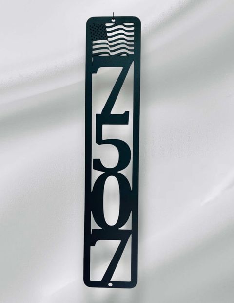 Showcase your address with patriotic pride using this custom metal address sign, featuring a beautifully detailed American flag silhouette alongside a personalized street number. This durable metal sign is designed to make a striking statement,...