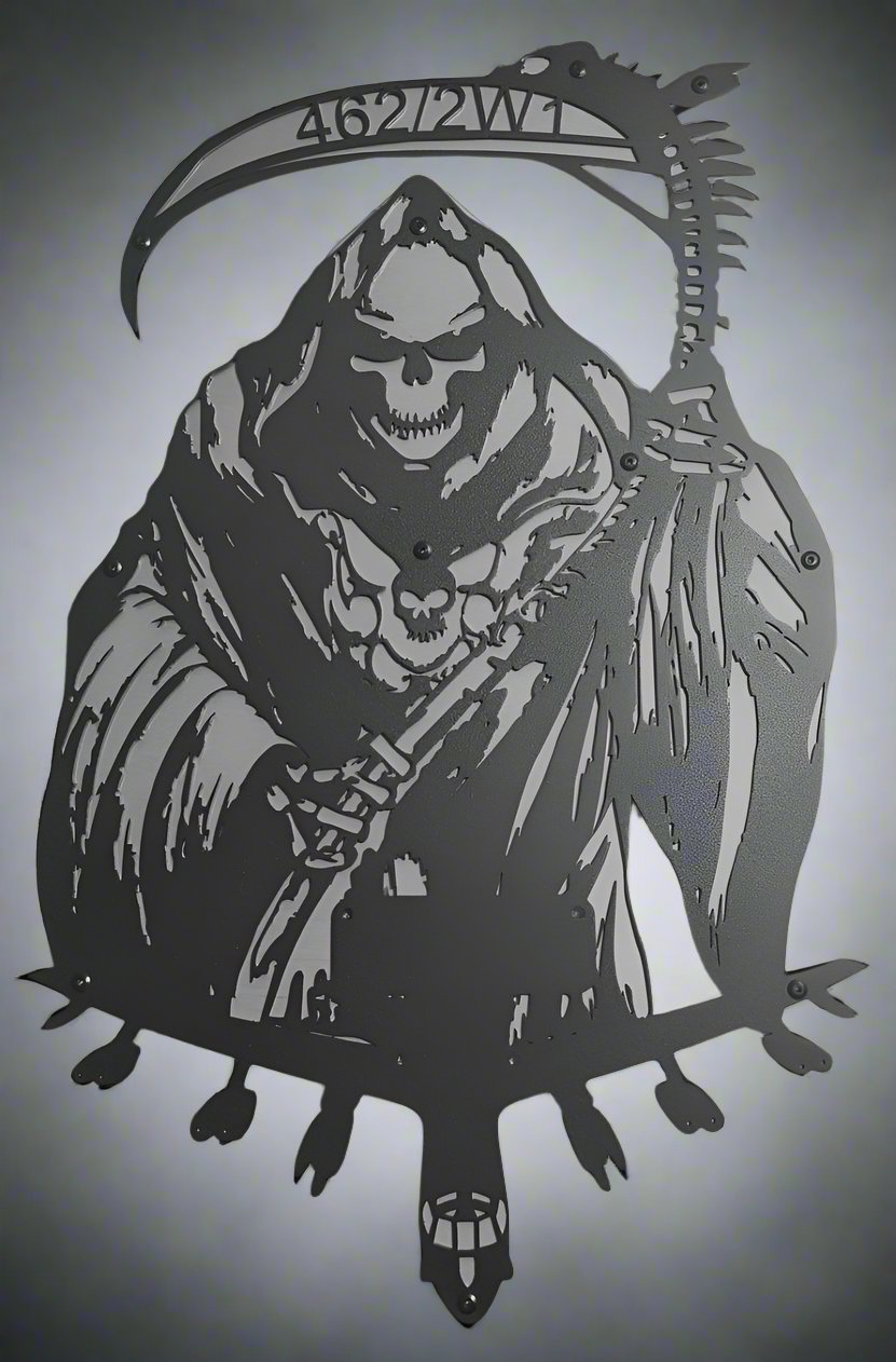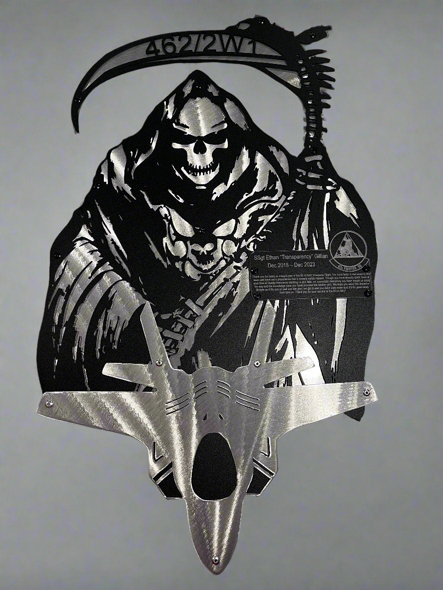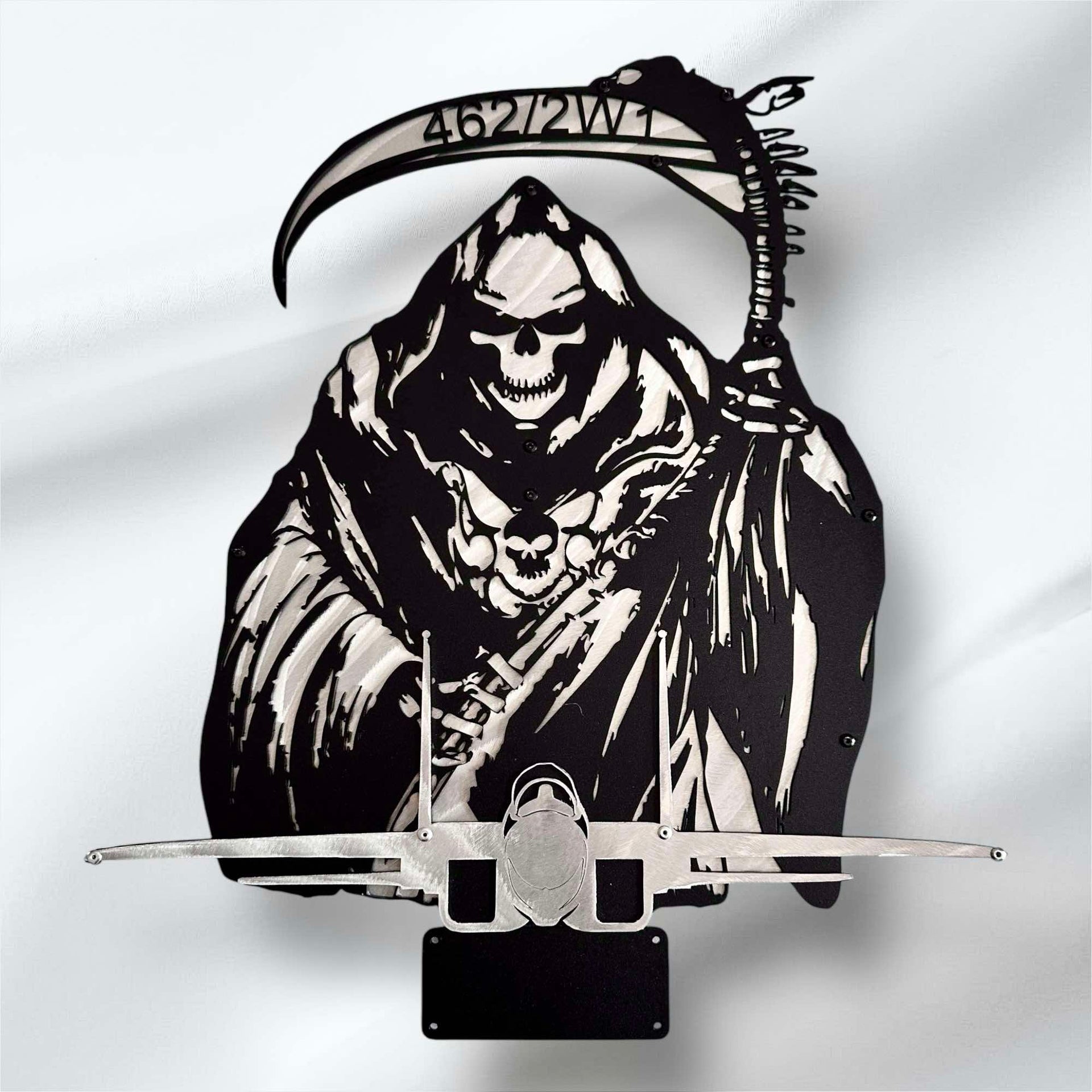 Weapons Reaper with Aircraft Honor the skill and dedication of weapons personnel with this custom metal art piece. Featuring a commanding Grim Reaper figure clutching a scythe with the 462/2W1 engraving, this design pays tribute to the...