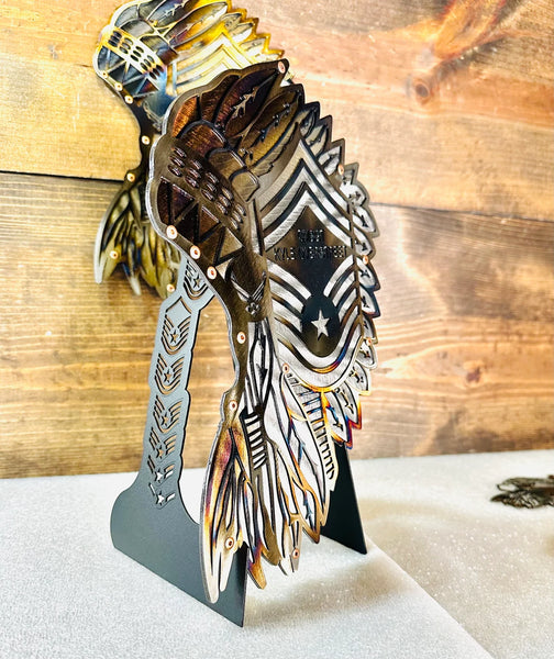 This exclusive Chief Master Sergeant Headdress is crafted from 16-gauge steel and paired with a custom metal rank stand, making it perfect for prominent display on a desk or shelf. At 12 inches, it's the ideal size for any setting, hand-ground, blued, and finished with a resilient powder coat for durability and aesthetic appeal.
